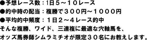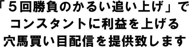 そんな私が今回提供いたしますのは、ワイドや三連複馬券に最適で、なおかつ複勝において5回勝負程度のかるい追い上げで利益を上げることのできる、そんな穴馬予想配信サービスです。